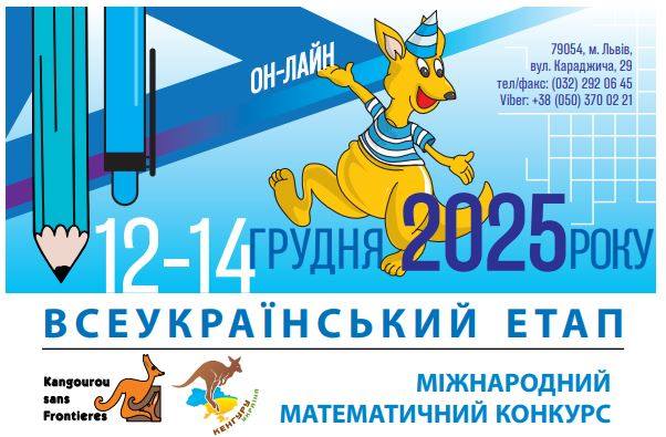 Повідомляємо, що з 12 по 14 грудня 2025 року буде проходити Всеукраїнський етап Міжнародного математичного конкурсу «Кенгуру». Учасниками можуть стати учні 2-6 класів. Конкурс проходитиме в режимі он-лайн та безкоштовно.